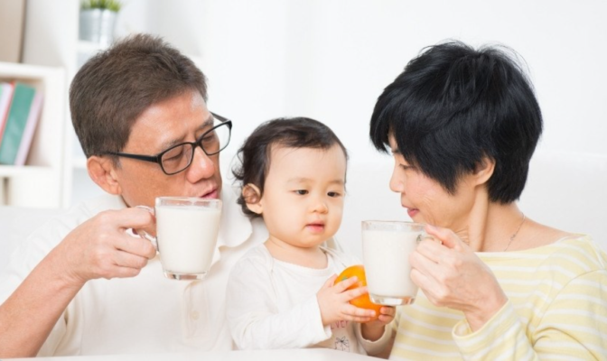 Hình ảnh mọi người (gia đình, trẻ em, người lớn tuổi) thưởng thức sữa cừu – minh họa lợi ích cho mọi lứa tuổi: