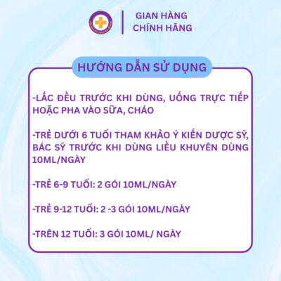 - Trẻ 9-12 tuổi: 2-3 gói 10ml/ngày.