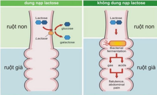 Lactose là loại đường đôi có mặt chủ yếu trong sữa động vật (như bò, dê, cừu), cần enzym lactase để tiêu hóa. Người không dung nạp lactose là người thiếu (hoặc không có) enzym lactase trong ruột non, dẫn đến việc không thể phân giải lactose thành glucose và galactose. Khi đó, lactose tồn tại ở đại tràng sẽ bị vi khuẩn lên men, gây đau bụng, đầy hơi, tiêu chảy sau khi dùng các sản phẩm từ sữa (Nguồn: NCBI).