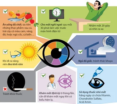 - Kiểm tra sức khỏe mắt định kỳ: Phát hiện sớm bất thường như mờ mắt, loá mắt, nhức mắt để can thiệp kịp thời.