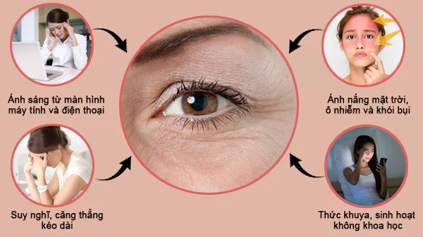 - Ảnh hưởng từ ánh sáng xanh máy tính, tia cực tím, môi trường độc hại hoặc bệnh lý nền (tiểu đường, huyết áp…)
